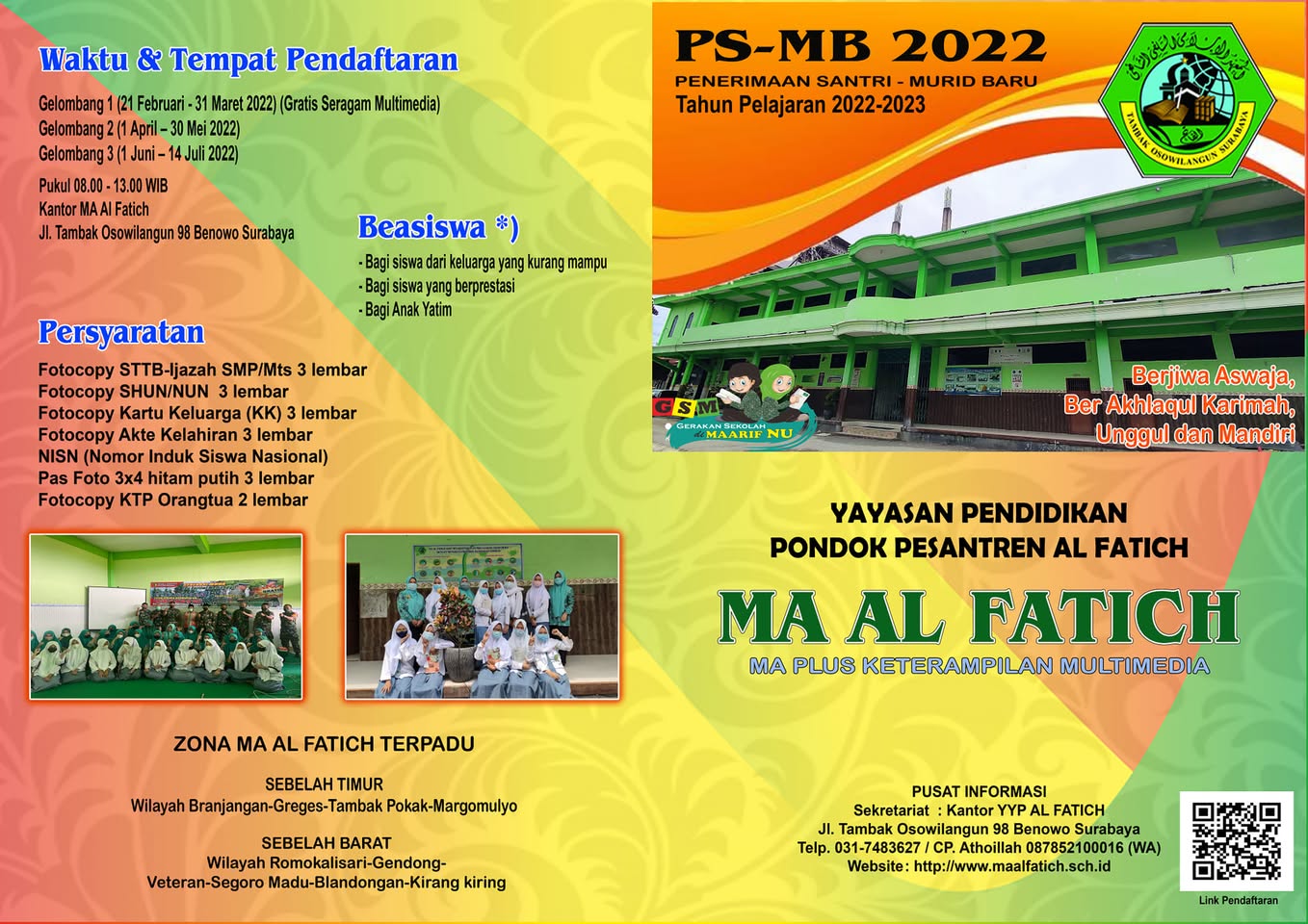 - Madrasah Tsanawiyah Al Fatich Siswa yang mendaftar di gelombang pertama mendapatkan GRATIS seragam 1 stel putih-biru